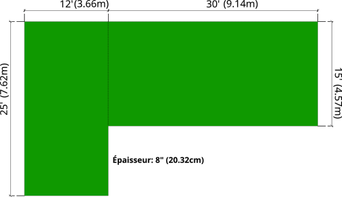 Dans l’exemple ci-haut, nous voulons niveler 8″ d’épais. Puiqu’il y a 12 pouces dans un pied, on va multiplier l’aire par le nombre de pouces et ensuite diviser le résultat par 12 pour convertir le tout en pieds cubes: